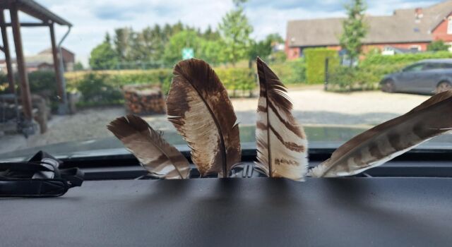 Op weg naar de locatie hebben we tijd om elkaar te leren kennen. Voor Marit het traject doorliep om boswachter te worden (ze is hier sinds december in dienst), volgde ze de modeopleiding in Arnhem. Iets daarvan draagt ze altijd met zich mee: de voortdurende verwondering over de vormenrijkdom van de natuur. Als kunsthistoricus deel ik die uiteraard. En zij heeft een gewoonte die ik ook heb: mooie zaken die je zonder schade toe te brengen kunt meenemen, brengt ze onder in een verzameling. In dit geval op haar dashboard. Daar prijken de mooiste veren. Van links naar rechts: wespendief (een armpen), zeearend (een staartveer, gevonden in de Biesbosch waar ze ook werkte), jonge oehoe (een handpen) en buizerd (een handpen). Veren van die laatste vogel, die algemeen voorkomt, deelt ze ook uit aan kinderen. Heb je toch maar mooi iets van een echte roofvogel!