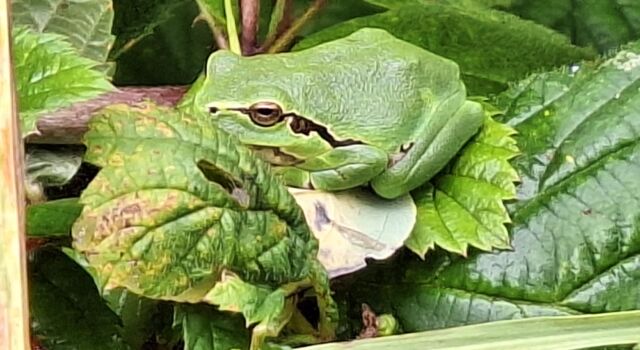 Ik ben zo verwend, dat ik het al haast ga verwachten. En jawel, ook Doreen heeft een verrassing. Even buiten het landgoed weet ze een plek waar er bijna de garantie is dat je een boomkikker ziet. Dat is een zeldzaam dier, maar áls hij er is, dan meestal ook in flinke aantallen. De boomkikker is afhankelijk van ondiepe poelen (zonder vissen, want die vreten de kikkervisjes op). Buiten de paartijd geven ze de voorkeur aan een mantelzoomvegetatie (dus aan een bosrand) met braam. Daar wijst Doreen ze mij aan. En omdat ik na de hazelmuis van vorige week reacties kreeg in de trant van pics or it didn’t happen: Kijk!