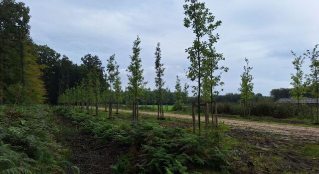 Doreen: ‘Het beheerteam wil graag een integraal lanenplan waar we decennia meer vooruit kunnen. Dat helpt ook bij subsidieaanvragen, want je laat zien dat je de waarden van de lanen nauwkeurig gewogen hebt. Het is trouwens een goeie zet om dood hout, zowel liggend als opgaand, dieper in de bosvakken te koesteren. En voor de lanen zelf kun je dan een strak, cultuurhistorisch correct, beeld hanteren.’ En dat is wat er gebeurde met de Holdrostlaan. Daar staan ze keurig in een driehoeksverband; nieuwe eiken die mooi aansluiten op een ander deel van de laan, ook in eiken. Wat er verdween zijn beuken die op waren. Een daarvan was wel heel bijzonder. Hij droeg een inscriptie die aangebracht was op Bevrijdingsdag in 1945. Het verhaal achter de inkerving is digitaal goed te vinden, en er komt een herinneringsbank.