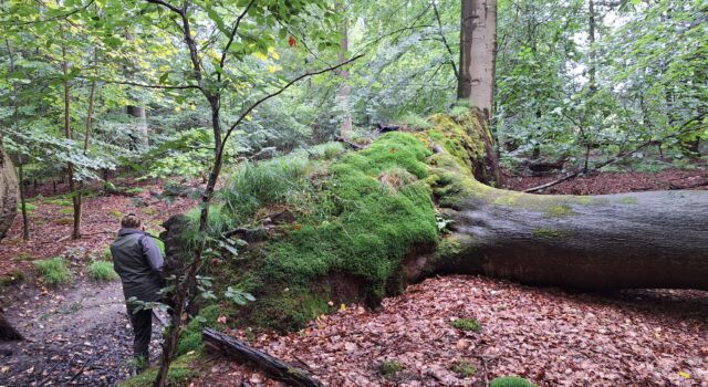 Doreen: ‘Het beheerteam wil graag een integraal lanenplan waar we decennia meer vooruit kunnen. Dat helpt ook bij subsidieaanvragen, want je laat zien dat je de waarden van de lanen nauwkeurig gewogen hebt. Het is trouwens een goeie zet om dood hout, zowel liggend als opgaand, dieper in de bosvakken te koesteren. En voor de lanen zelf kun je dan een strak, cultuurhistorisch correct, beeld hanteren.’ En dat is wat er gebeurde met de Holdrostlaan. Daar staan ze keurig in een driehoeksverband; nieuwe eiken die mooi aansluiten op een ander deel van de laan, ook in eiken. Wat er verdween zijn beuken die op waren. Een daarvan was wel heel bijzonder. Hij droeg een inscriptie die aangebracht was op Bevrijdingsdag in 1945. Het verhaal achter de inkerving is digitaal goed te vinden, en er komt een herinneringsbank.
