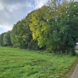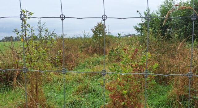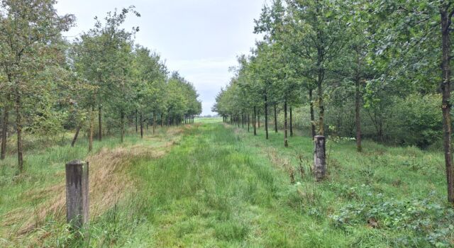 Om reeënvraat te voorkomen staat er nu nog een hek omheen en het geheel toont wat iel. Maar geef het een paar jaar. Dan wandel je hier door prachtig en soortenrijk nieuw bos. Over een slingerpad overigens, wat ondenkbaar is binnen het trapezium. Daar heersen symmetrie en de rechte lijn.
