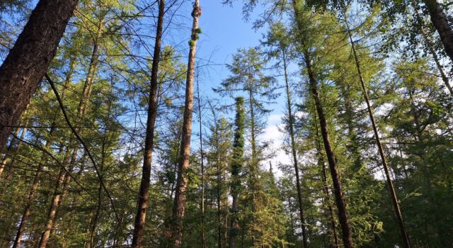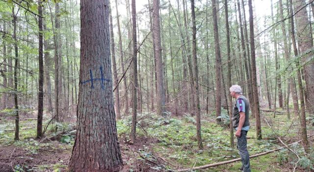 Een aantal bosvakken die we vandaag bezoeken was oorspronkelijk, tussen 1947 en 1953, ingeplant met lariks. Van die eerste generatie ging bij een storm in 1990 zo’n 80 procent om. Er volgde een goede natuurlijke verjonging, met ook heel wat eik tussen de lariks en her en der een overlever van de storm. Deze grote bomen zijn in het begin erg nuttig omdat ze de jonge exemplaren beschermen tegen bijvoorbeeld te heftige zoninstraling of wind. Maar wanneer de tweede generatie uitgroeit raken de toppen de zijtakken van de oude bomen, waardoor er een ongewenst ‘knoteffect’ optreedt. Dat is het moment voor Harco om in te grijpen. De oude lariksen worden ‘staand gesnoeid’, dat wil zeggen van hun zijtakken ontdaan. En in de jonge opstand vindt een dunning plaats, zodat je daaruit de beste bomen overhoudt. Het levert een bijzonder bosbeeld op, vooral wanneer je eenmaal de opgesnoeide lariksen (‘sigaren’ noemt Harco die) herkent. Ze vormen wat nieuwe toeven groen (waterlot) maar staan er verder kaal bij. Door zorgvuldig te kiezen welke bomen je oogst en welke je spaart, heeft het bos een ‘ruggengraat’, die in de loop van de tijd vervangen wordt door exemplaren die nu nog jong zijn.
