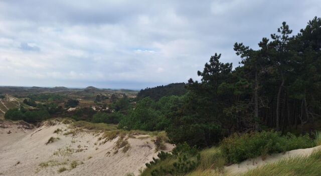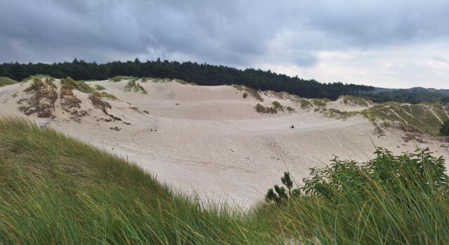 Heel anders is dat bij de Baaknol. Daar mag het zand juist weer stuiven en zijn na de kap alle stobben verwijderd. De enorme zandmassa schittert je zelfs op deze regenachtige ochtend tegemoet. Met de zon erop moet het geheel oogverblindend zijn. Dat heeft overigens alles te maken met de oorsprong van het zand. ‘Dat werd aangevoerd door de Eridanos, de oerrivier die vanuit Scandinavië en het Baltisch gebied zo’n twaalf miljoen jaar geleden het Noordzeebekken bereikte. Het fijne, witte zand dat je hier nu ziet, is geërodeerd materiaal uit dat noordelijk oorsprongsgebied. Schoorl is het zuidelijkste afzettingsgebied van dit kalkarme zand.’ Aan de randen zien we hoe helm zich alweer vestigt. Die wordt wellicht ook weer overstoven, maar spannender is dat ‘het zand ook het bos in mag rollen’.