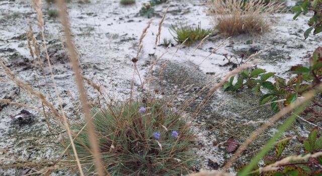 Wat er voor terugkwam is het voorzichtig begin van duingrasland. Sommige soorten die op deze kalkarme bodem thuishoren, zijn er al. Her en der bloeit het biggenkruid nog en we treffen zelfs een pol bloeiend zandblauwtje aan. ‘In juni wordt dit palet van geel en blauw nog aangevuld met het roze van de reigersbek, dat is een schitterend gezicht. Naast de zandhagedis zullen ook tal van insecten profiteren van de ingreep, zoals bijensoorten, de kleine parelmoervlinder en de blauwvleugelsprinkhaan.’