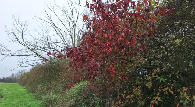 Je hoort altijd dat je de streek moet bezoeken in het voorjaar wanneer de meidoorn en sleedoorn bloeien (die volgen elkaar op) of juist in de winter; dan zie je het skelet van al die heggen zo mooi. Maar ik ben heel gelukkig met het herfstbeeld nu in De Weitjes. Het is wat grauw, waartegen alles zo fraai afsteekt: het vele groen dat er nog is, hazelaars in het geel, net als de Spaanse aak maar die laatste net wat feller, het diepe rood dat al wat naar zwart neigt van de meidoornbessen maar bovenal de luister van de wilde kardinaalsmuts. De knotwilgen zijn al kaal, de essen vertonen een enorme variatie, van bijna nog vol in blad tot een louter silhouet van takken. Wellicht heeft dat te maken met de essentaksterfte, maar dat weet je pas zeker in het voorjaar wanneer de bomen al dan niet uitlopen. Het is nogal wat om te bedenken dat al dat schoons er is omdat het vroeger gebruikt werd. Snoeiafval van de heggen en de bomen die erin staan, bestond niet: alles deed op z’n minst dienst als brandhout. Vaak werd dat samengebonden tot takkenbossen (mutserds of mutsaards genoemd). Waarbij, zo vertelt Gert, zo’n partij van de Spaanse aak het beste aanmaakhout leverde.
