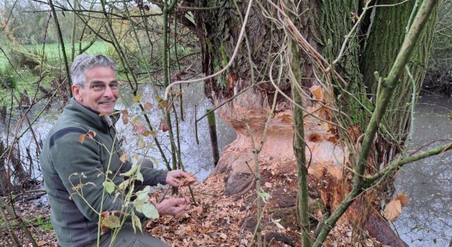 De biodiversiteit in het Maasheggengebied is hoog. Allerlei soorten van (vochtige) schraalgraslanden komen hier voor, al zien we nu voornamelijk het groen van het veenreukgras (‘zoete gras’) en de smalbladige weegbree. Van oudsher werden er drinkpoelen (wetterpoelen) voor het vee aangelegd. Die zijn nu hersteld, en soms zijn er nieuwe gemaakt omdat ze goed zijn voor de amfibieën. Bij de Rekgraaf, die water uit het gebied afvoert, laat Gert me de sporen van een relatief nieuwe soort zien. Of beter; van een soort die lange tijd weg was: de bever. Nog los van het feit dat het dier zijn eigen biotoop vormt door strategisch bomen om te leggen en zo waterlopen af te dammen, moet hij ook altijd knagen om de voortdurende groei van zijn tanden in toom te houden. Het resultaat daarvan zien we bij een enorme schietwilg.