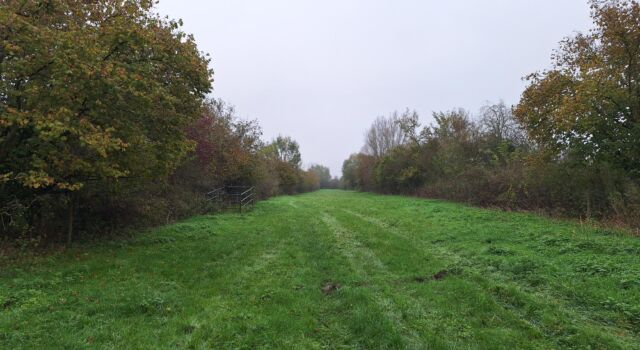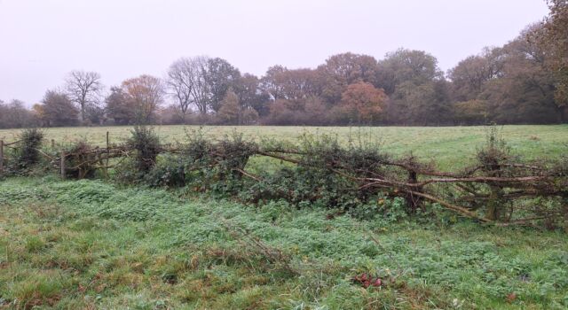 Bij de oorspronkelijk aanleg van de heggen ging het vaak om kleine percelen, zoals Gert laat zien bij De Weitjes: smalle stroken grasland zijn hier aan alle zijden omzoomd met heggen. Aan de overzijde van de weg, liggen grotere stukken, maar ook die hebben heggen. Het effect is ronduit labyrintisch, zeker wanneer we door het hek gaan en De Weitjes betreden. Voor ik daar iets over zeg; eerst iets over die typische hekken die we hier overal zien. Ze worden Maashekken genoemd en in een lokale smederij gemaakt. Met klinknagels; een stuk vakmanschap dat het oog pleziert. Op het hek hier moet de naam nog worden aangebracht (Gert bedacht ‘De Weitjes’, het is geen historische naam, maar wel een toepasselijke). Het Waterschap stelt als eis aan de hekken dat ze de doorstroming van het water niet mogen belemmeren, vandaar dat hun raster niet al te dicht is