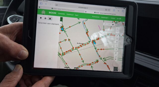 Gert toont mij op z’n tablet het BOOM, dat is het Systeem Beheer Onderhoud op Maat. Daarin zijn alle heggen maar bijvoorbeeld ook alle individuele knotbomen (803 in De Bergjes) opgenomen. Pijlen op de kaarten geven de rijrichting aan, zodat het helder is wat met links of rechts bedoeld wordt. Dat is belangrijk bij de beheerinstructies die aannemers krijgen. Na het uitvoeren van de klussen checkt Gert het werk en wanneer het goed is uitgevoerd vinkt hij het af in het systeem. Wat op veel plaatsen zo is, geldt hier extra: niets doen is geen optie.