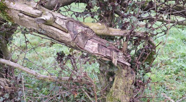 Ik moet natuurlijk tegen zo’n bovenligger duwen om z’n stevigheid te testen. En die is indrukwekkend. Maar ik verstoor een winterkoninkje dat weghipt, dus ik laat het er snel bij. Gert: ‘In de heggen komen ook goudhaantje, heggen- en ringmus, vinken en allerlei mezen voor.’
