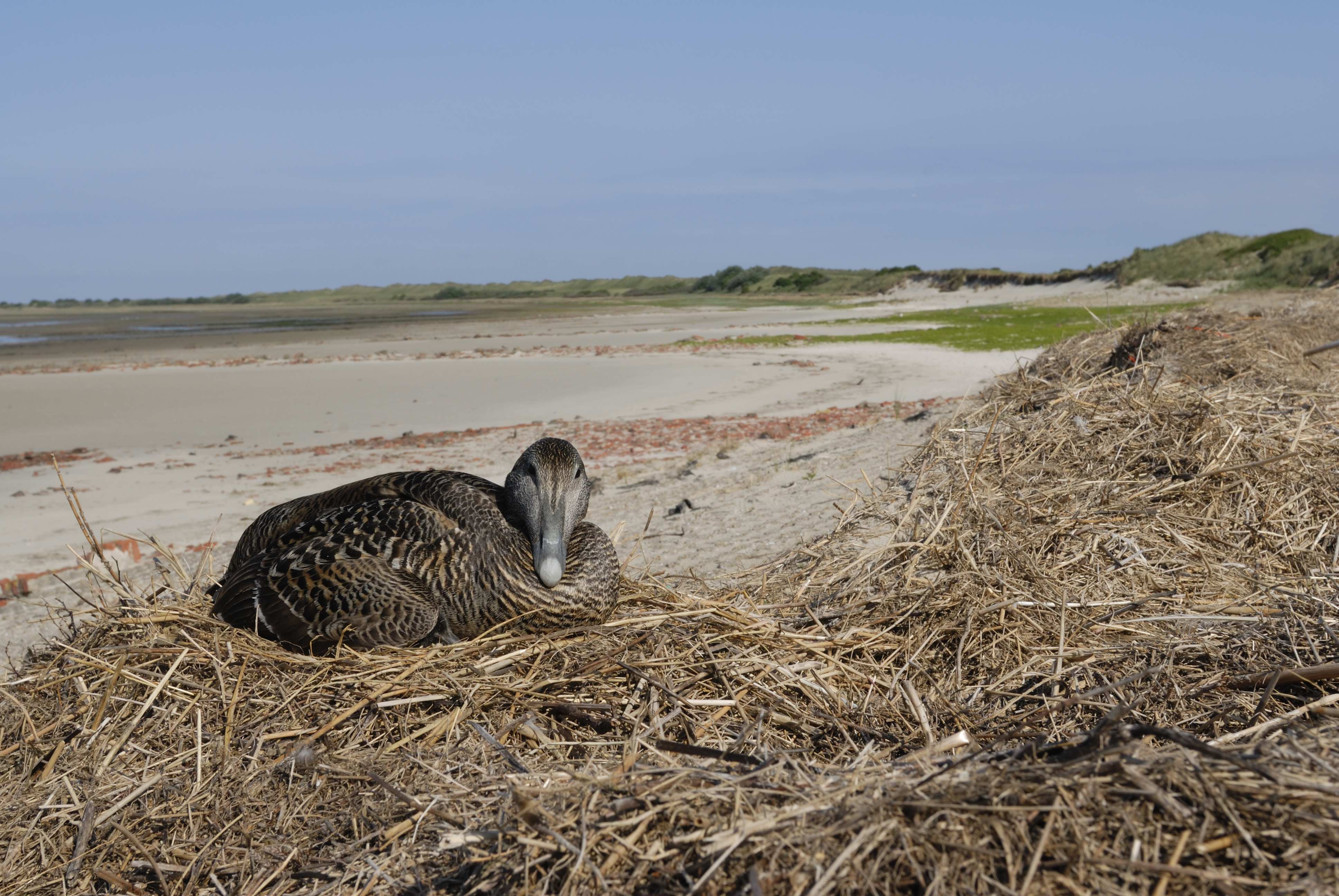 Op 14 april vonden we al twee nesten met 4 eieren. De voorgaande jaren werden de eerste nesten rond 20 april gevonden. Daar de soort ongeveer 3 weken broedt kunnen we begin mei de eerste pullen verwachten. Vanaf de uitkijktoren van Rottumerplaat tellen we dan het aantal vrouwtjes en hun pullen. Hiermee krijgen we eveneens een indruk van het broedsucces. Vrouwtjes en jongen vormen groepen. Deze groepen verlaten met afgaand tij het eiland via de slenken om in dieper water voedsel en veiligheid te zoeken. De zilver- en kleine mantelmeeuwen liggen op de loer! Rottumerplaat is een belangrijk broedgebied voor eEiders. Eén vijfde van de in Nederland broedende Eiders broedt hier.
