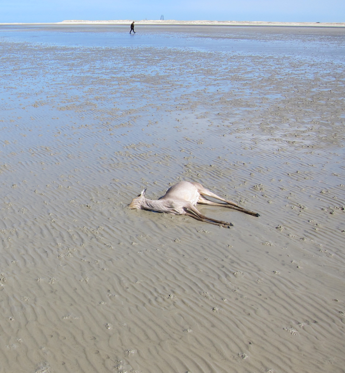 In de vroege middag van 3 mei j.l. werd tijdens een inspectieronde over de stranden van Rottumeroog op het Noordzeestrand tijdens laag water een vers spoor van een ree aangetroffen. Dat was natuurlijk een vreemde gewaarwording, want op Rottum leven geen reeën en de enige prenten van zoogdieren die je op de eilanden tegen zult komen zijn (naast meestal onze eigen voetstappen) die van konijnen.
