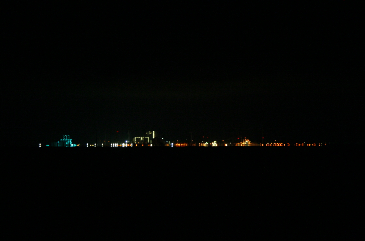 Rottumeroog ligt in het verlengde van de monding van de Eems. Daar waar rivieren op zee uitmonden ontwikkelde de mens van oudsher havens. Zo ligt ten zuidoosten van Rottumeroog op zo’n 15 km afstand de Eemshaven. Begin jaren zeventig is deze versneld tot ontwikkeling gekomen. Naast bebouwing in de vorm van grote energiecentrales en chemische industrie werden er ook steeds meer en hogere windmolens geplaatst. Er staan er nu 88. Met verlichting lijkt er ook niet spaarzaam te worden omgesprongen. Bij helder weer lijkt het ’s nachts door de gekleurde lampen op een kermis.