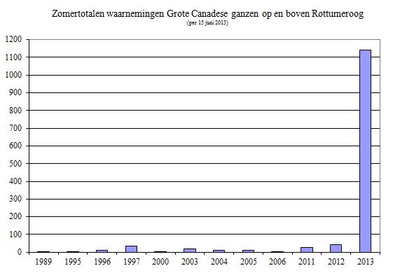 Het waarnemen van groepen canadese ganzen in Nederland is een betrekkelijk nieuw fenomeen. De reden hiervoor zal zijn dat er pas sinds een jaar of twintig hiervoor voldoende aantallen in Nederland broeden. Vooral in het midden van het land, vanuit Brabant over de Flevopolders richting Groningen en Friesland, lijkt er een trekbaan van canadese ganzen op ruitrek te bestaan. Verondersteld wordt dat de meeste van deze vogels naar noordelijker en oostelijker gelegen ruigebieden vliegen, zoals in Friesland en Groningen, waar enkele van deze plekken bekend zijn. Vermoedelijk hebben veel van deze dieren sinds kort een nieuw ruigebied gevonden, verder ten oosten of noordoosten van ons. Nooit eerder werden er ’s zomers zoveel canadese ganzen boven Rottumeroog gezien en geteld. Reden voor ons om eens de zomerwaarnemingen en aantallen van deze soort op en boven ons eiland op een rijtje te zetten.