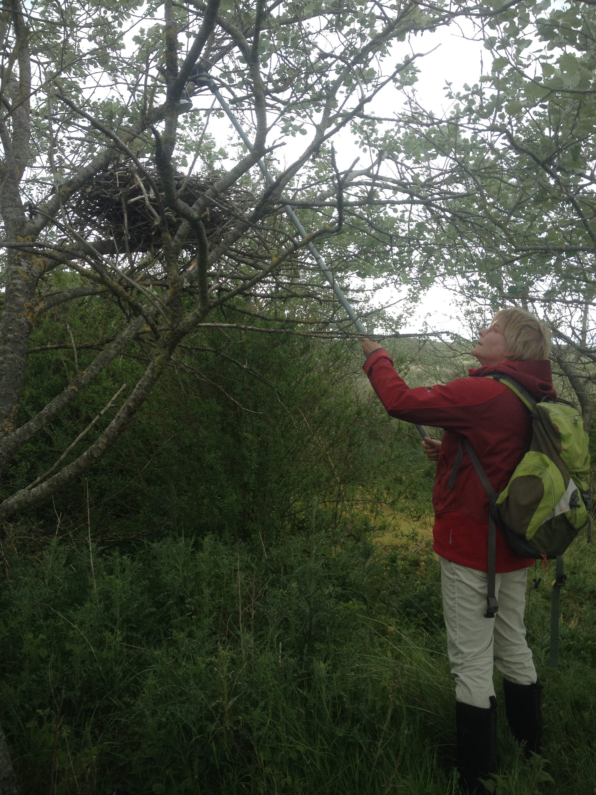 Natuurlijk dragen we ons steentje bij aan de jaarlijks monitoring van broedvogels, de hoogwatertellingen van vooral steltlopers en enkele onderzoeksprojecten die hier lopen. Onder andere de controle van alle nesten in bomen en struiken stond voor ons op het programma. Vroeg in het seizoen worden die, als ze nog geen blad hebben, nesten vastgelegd en gecontroleerd. We vonden een nieuw nest van een zwarte kraai, en een van de buizerd-nesten had kleine jongen. Een spiegel op een uitschuif-stok is daarbij een onmisbaar hulpmiddel, ook al zijn de bomen op Rottumerplaat niet hoger dan een meter of drie-vier.