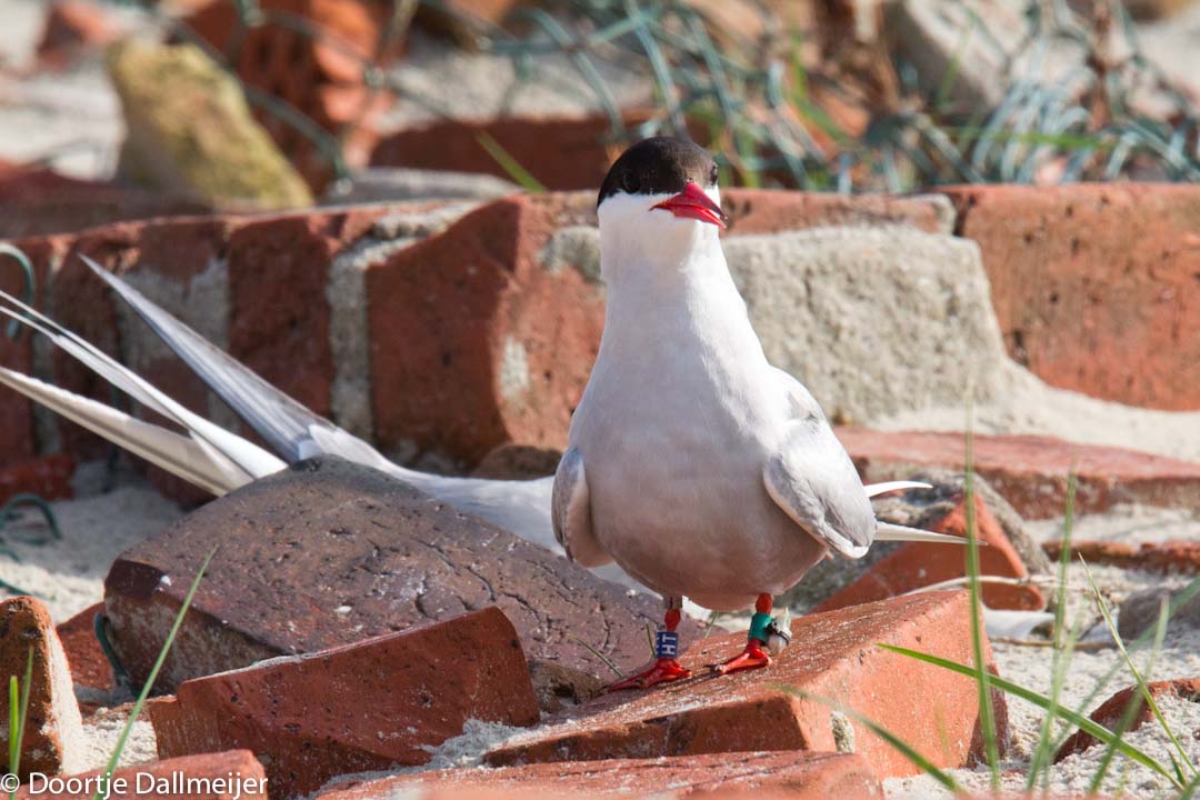 Meteen even zoeken op de kleurringen website van Dirk Raes, en zo kwamen we op de naam van Derick Hiemstra, die Noordse sSterns ringt bij de Eemshaven. Daar was deze stern geringd. Dit jaar broeden er bij de puindammen op de oostpunt van Rottumerplaat niet alleen zo’n vijftien paartjes dwergsterns, maar ook zeker zo’n 20 paar Noordse Sterns.