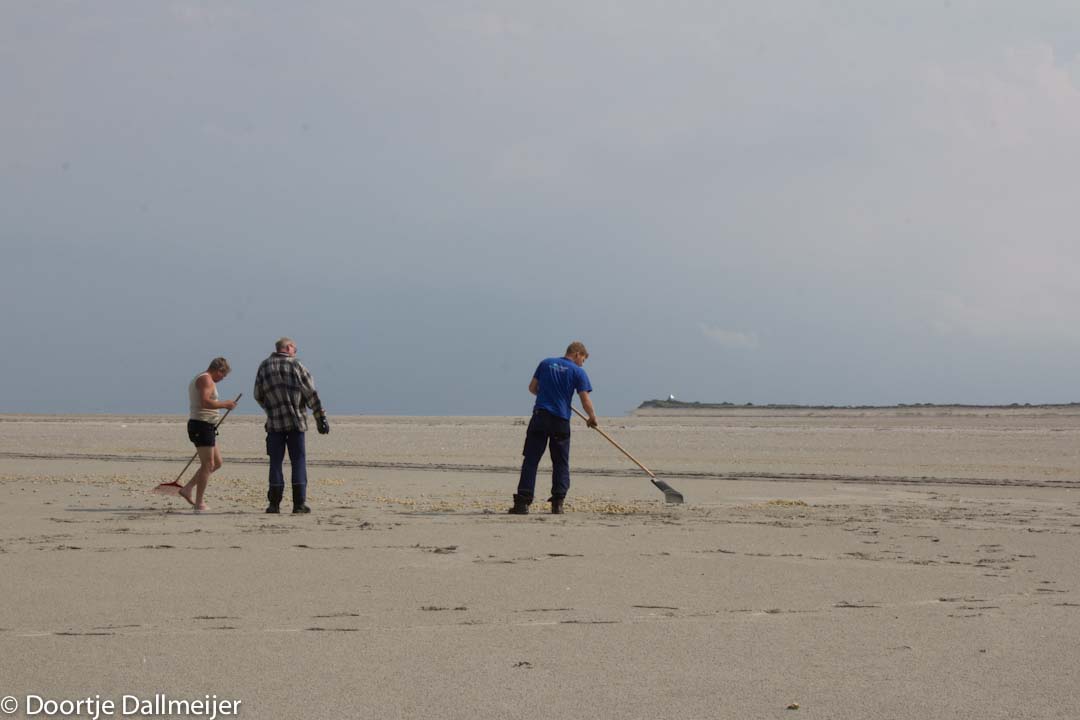 Een ploeg van vijf man hervatte de werkzaamheden om de aangespoelde brokken paraffine bijeen te harken en af te voeren.