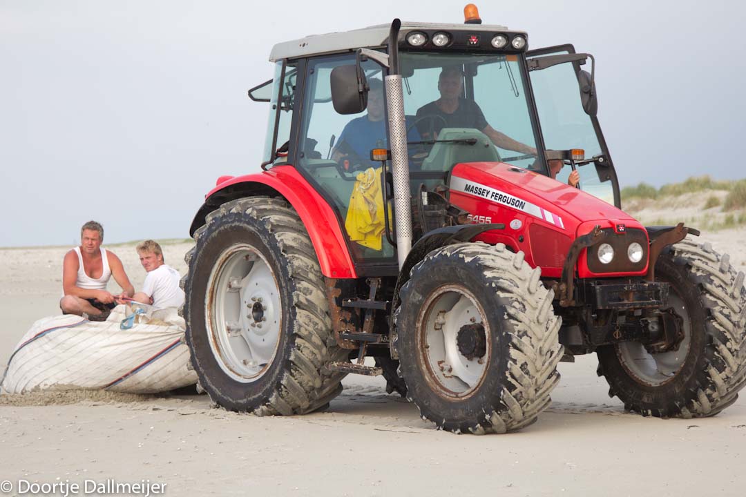 In het voorgaande weblog werd al melding gemaakt van de grote hoeveelheden aangespoelde paraffine. Dat moest opgeruimd worden. Op het westelijke strand stonden twee tractoren geparkeerd, en op maandag 13 juni om 17:00 uur gingen twee schepen van Andre Borsch Duikservice (BDS) uit Harlingen voor anker in de Lauwers: de BDS Transporter en de BDS Surveyor.