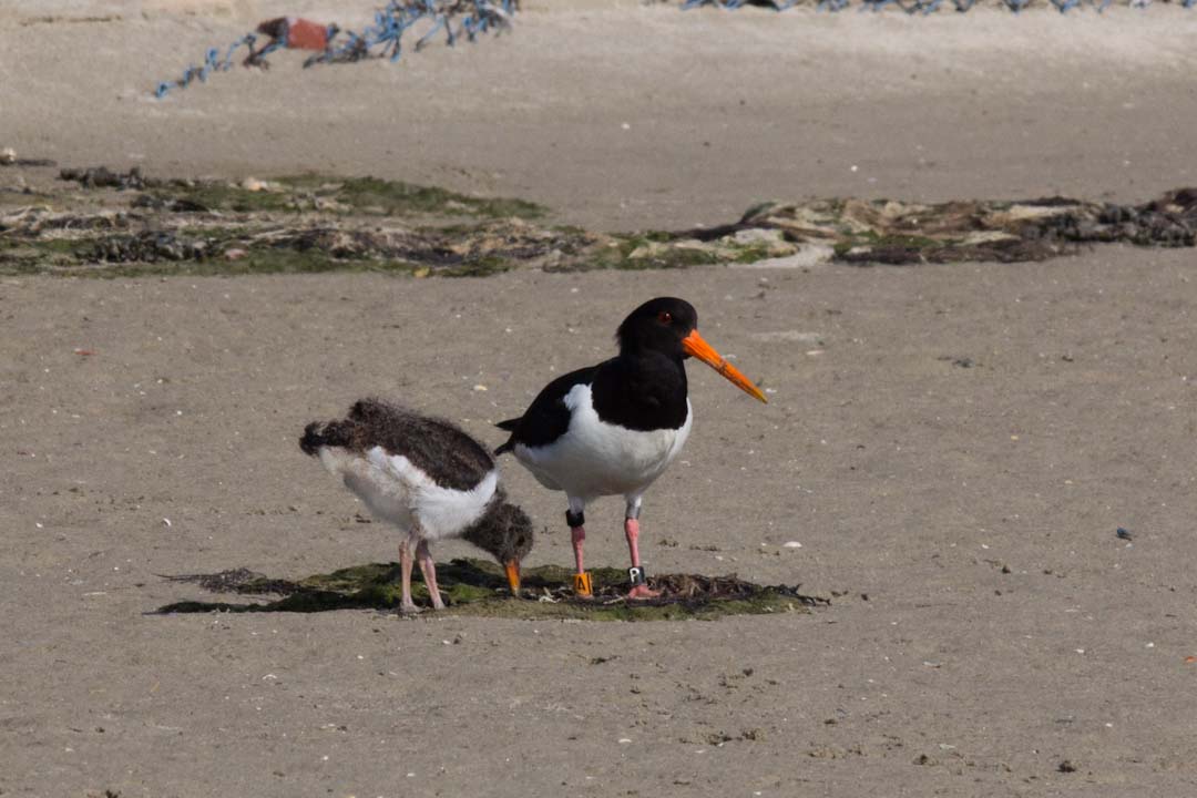 Sjoerd Dirksen had voor het scholeksteronderzoek van Sovon twee scholeksters op het nest gevangen en geringd, en een van hen liep trots rond met een al flink gegroeid kuiken. Terwijl scholeksters in Nederland in aantal teruglopen, ook zoals in het vorige weblog beschreven, als broedvogel op Rottumerplaat, is het verheugend dat deze RB-BPOA (links zwart P/ rechts oranje A) er wel in lijkt te gaan slagen een jong groot te krijgen.