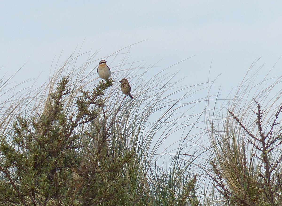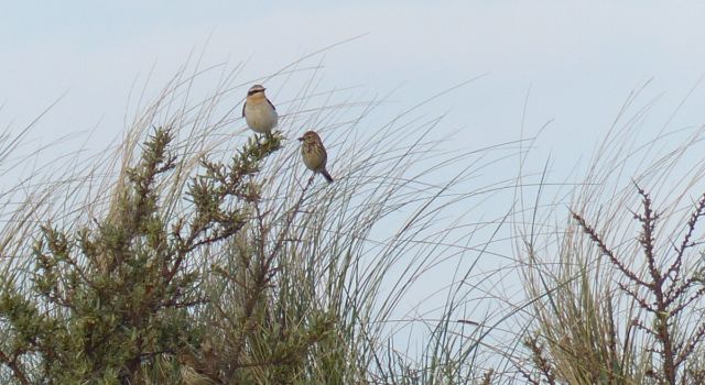Broeden en doortrek is eind mei tegelijkertijd waar te nemen. Op de volgende foto is rechts een graspieper te zien, met voer in de bek. Klaarblijkelijk heeft deze vogel al jongen vlakbij in het nest die altijd hongerig zijn. De vogel links is een tapuit, die broedt niet op de Rottumerplaat maar waarschijnlijk veel noordelijker, wellicht moet deze vogel nog helemaal naar IJsland of verder, naar Groenland, en is dus nog lang niet aan broeden toe!