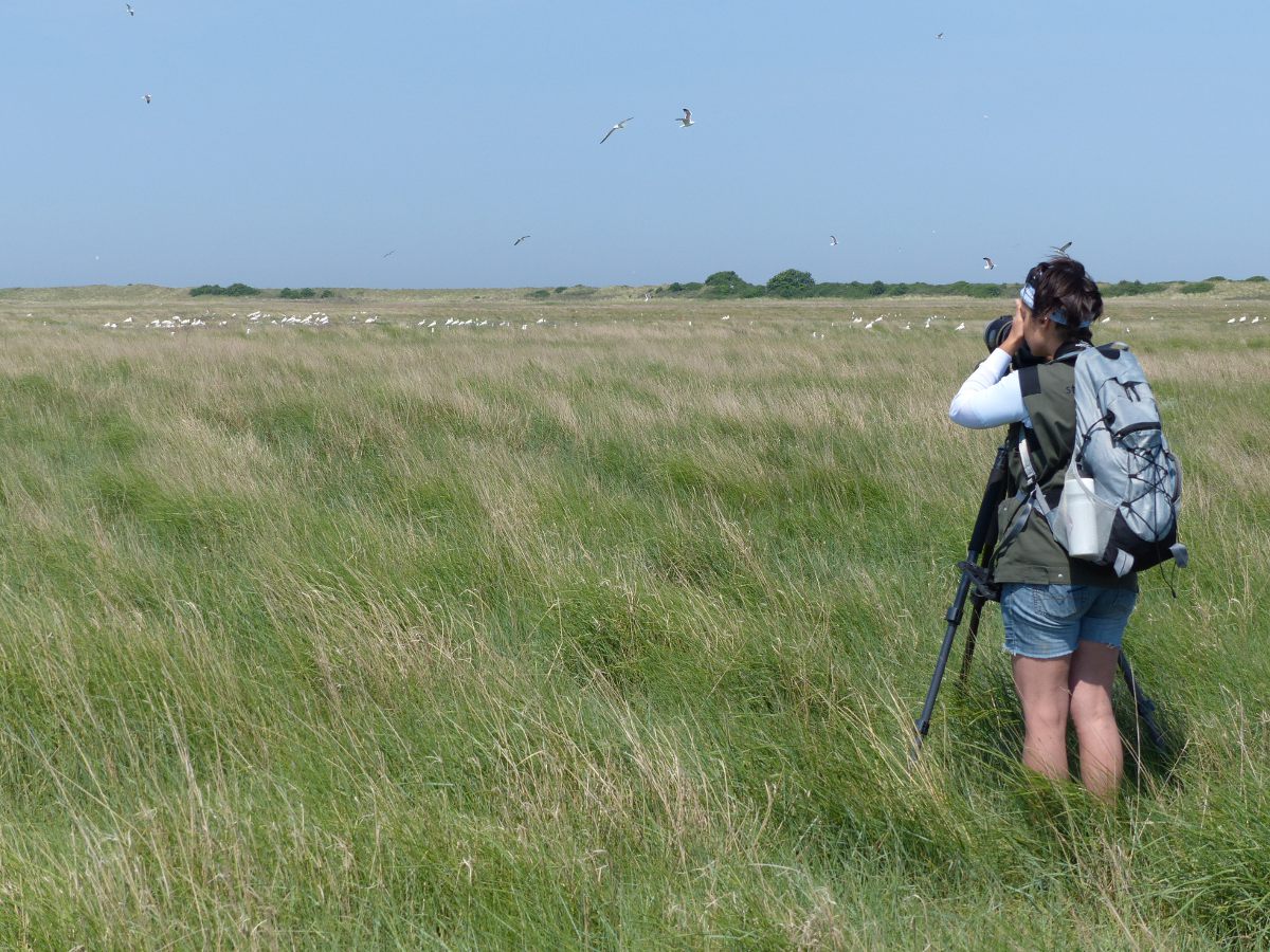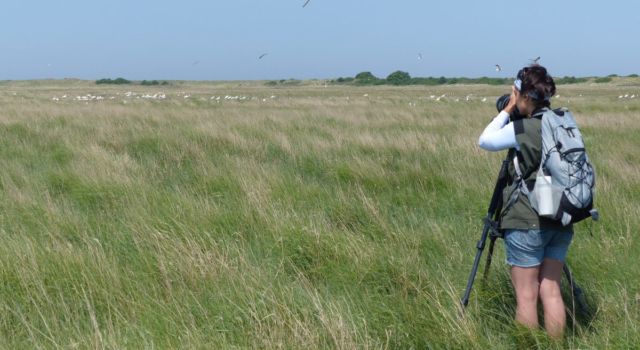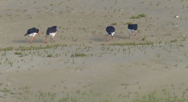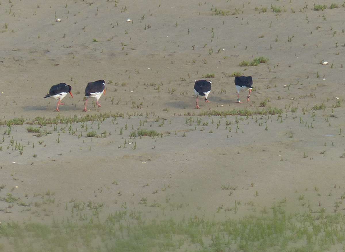 Eén van de onderzoeksdoelen dit voorjaar is het monitoren van het broedsucces van de scholeksters op het eiland. We doen dat door broedende vogels te voorzien van kleurringen zodat zij individueel gevolgd kunnen worden. Scholeksters met hun nog jonge kuikens zijn plaatstrouw totdat de jongen kunnen vliegen. Omdat we weten hoeveel eieren er in het nest zaten, en hoeveel grote jongen er weken later nog bij de ouders rondlopen (en hoeveel niet!) kunnen we inschatten of het een succesvol broedseizoen voor deze mooie wadvogel is of niet.