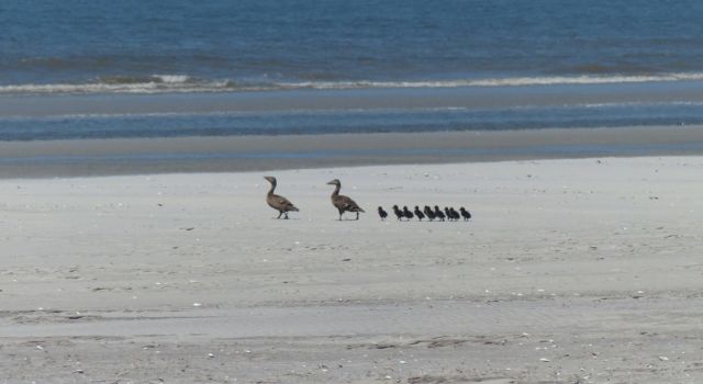 Bij de eerste eiders, die relatief vroeg beginnen met broeden, zijn de eieren al uitgekomen en lopen de jongen “creche-gewijs”, onder begeleiding van waakzame ouders naar open water, dat toch wat veiliger is dan de duinen met al die hongerige grote meeuwen.